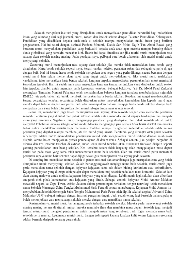 Ini kerana pihak sekolah sentiasa mengadakan pemantauan dari semasa ke semasa. Hasrat ini dapat direalisasikan jika murid-murid menunjukkan rasa sayang akan sekolah masing-masing. Karangan Bahasa Melayu BM SPM.